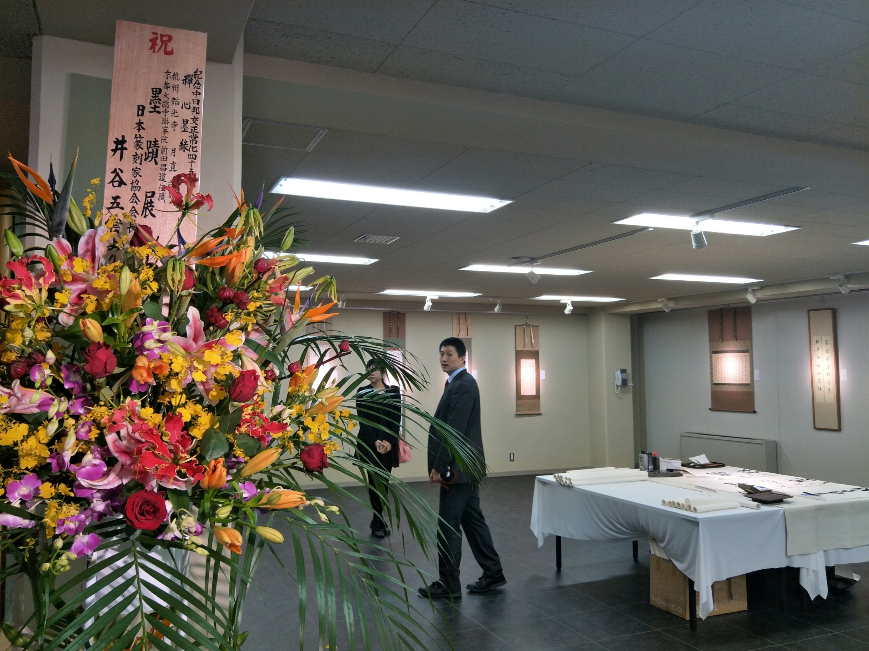 记者还看到蝸廬美術館階前廊下花団錦簇一派贺祝喜庆。赠花祝贺的名牌上写着:日本篆刻家協會會長 井谷五雲先生、日本書芸院名譽顧問 杭迫柏樹先生、京都造形芸術大學教授 李庚先生等。