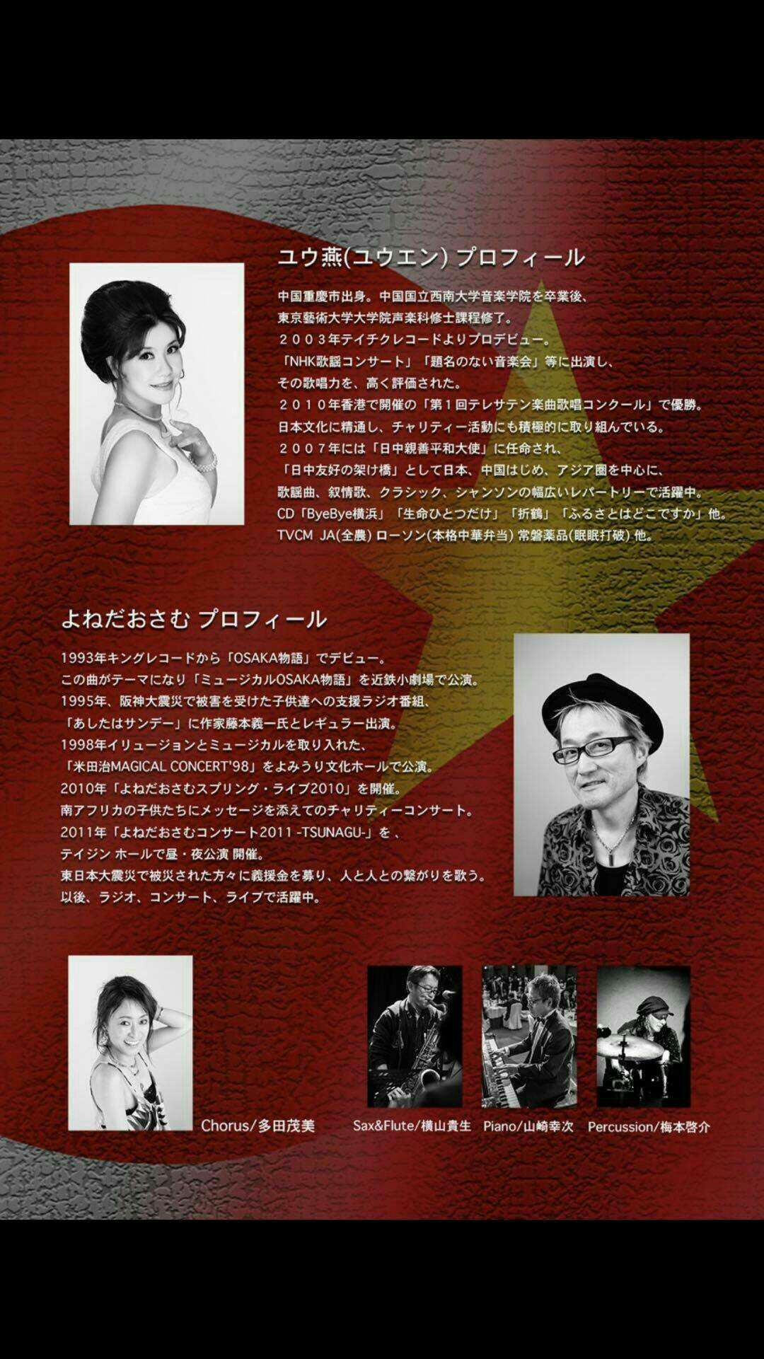 上海市と、大阪市が44年間育んだ友好関係を祝して、「上海の歌姫ユウエン」と「大阪を代表する熱いミュージシャン よねだ おさむ 」の、異色の、夢のコラボステージの実現に漕ぎ着けました!皆様で、2時間の夢のステージを御堪能頂ければ幸いです!