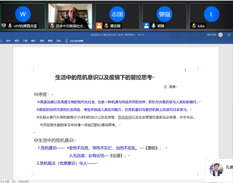 会议邀请国際医学专家,美国麻省大学医学院终身教授,国际疫苗学会前主席卢山,日本財专家:稅理士法人東天滿綜合会计事务所代表黑崎宏先生,税理士法人東天滿綜合会计事务所中国事所中国事业负责业负责人张女士,危化管控专家管控专家、企业监察一级、原北京海外专家咨询委员会专家委员王海峯先生作了专题讲演。专家们就“新时期中人和企业的健康认知与智慧发展”这个主题,从不同角度各抒己见、建言献策。使与会者受到了新的启发,与会者希望今后就类似的研讨会多进行几次,以更利于在日本的华侨华人对疫情的了解和应对。会议最后认为;在2021年这一新的起点,新的征程,新的挑战里在日本的华侨华人面对疫情要勇往直前,去争取新的发展,新的成就!