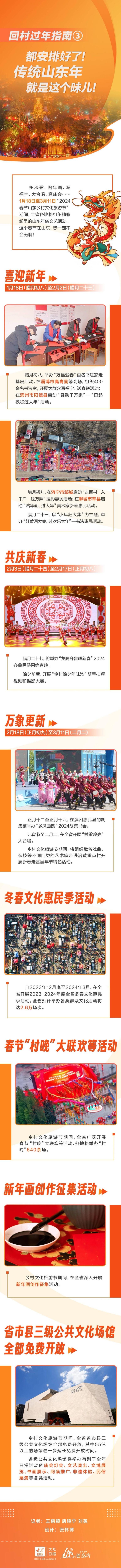 扭秧歌、贴年画、写福字、大合唱、逛庙会……1月18日至3月11日“2024春节山东乡村文化旅游节”期间,全省各地将组织精彩纷呈的山东年俗文艺活动。这个春节在山东,您一定不会无聊!