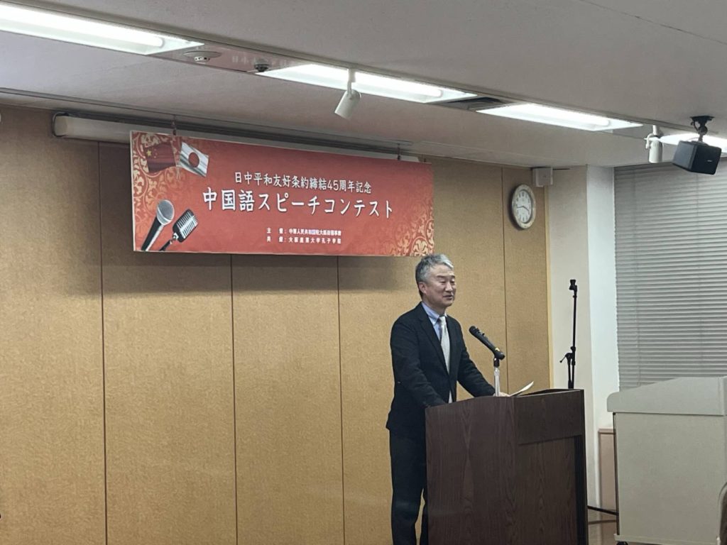 中国驻大阪总领事馆教育处处长聂瑞麟代表主办方致辞,对大力支持此次赛事的各大、中学校和评委老师们表示衷心感谢。他鼓励参赛选手们以本次比赛为契机,更好地学习中文、了解中国,将来有机会去中国留学。聂瑞麟表示,中日两国友好交往的历史源远流长,希望有更多的学生进入中文之门,进而通过中文对中国,不光是古代中国,也对现代中国有更深的理解。