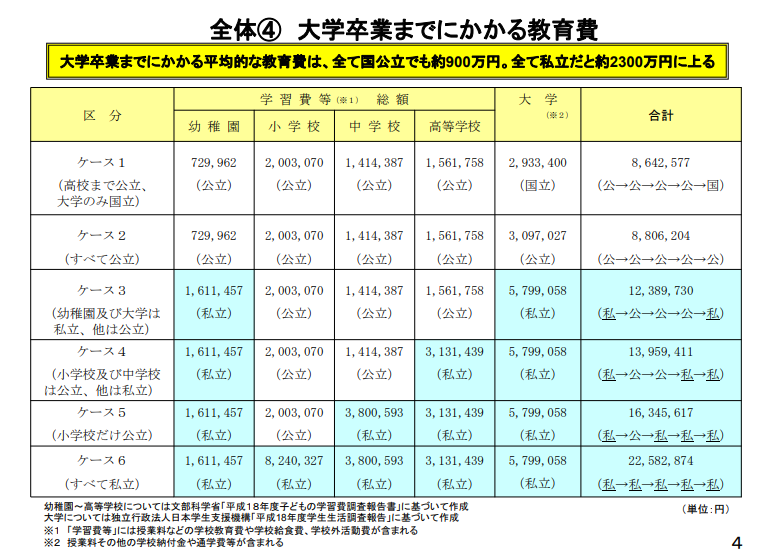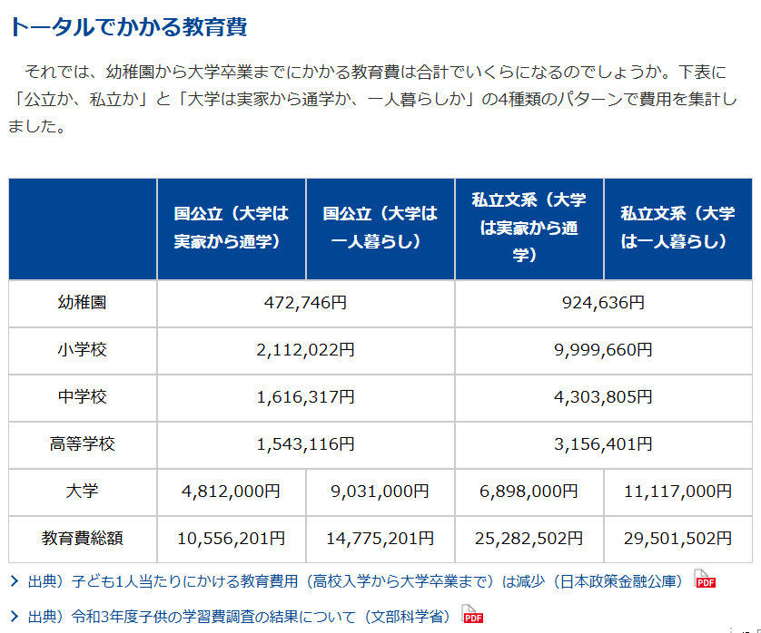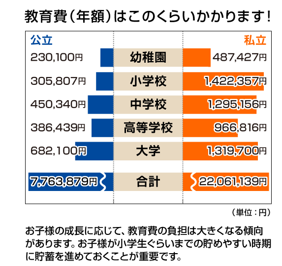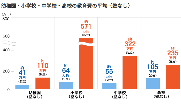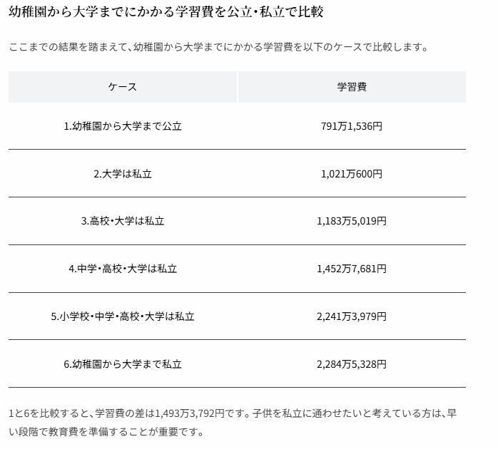 国家公立和私立学校之间的教育费用至少在200万日元以上。特别是私立大学,根据孩子选择文科还是理科,费用也会有很大差异。
