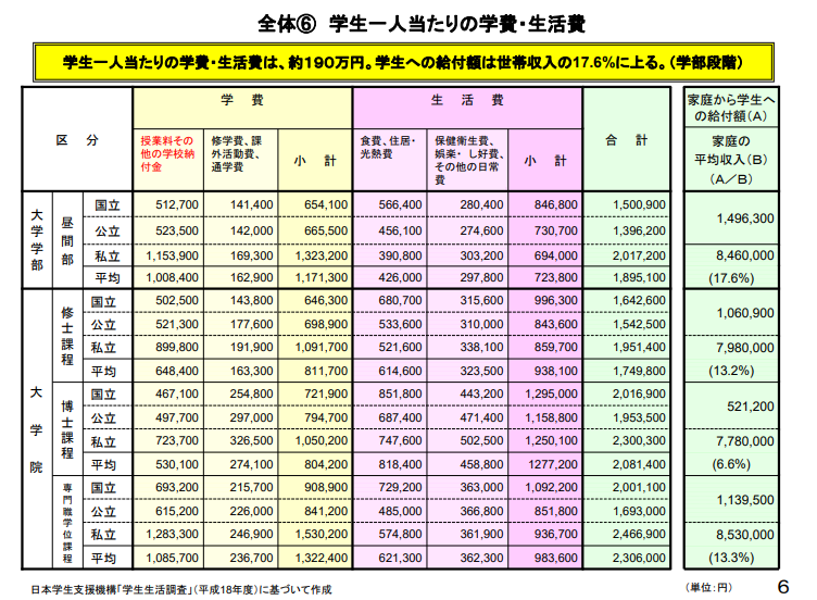 根据日本政策金融公库2021年度“教育费负担实状况调查结果”,大学毕业前的教育费用,国立公立大学平均4,812,000日元,私立大学文科平均6,898,000日元,私立大学理科平均8,216,000日元。